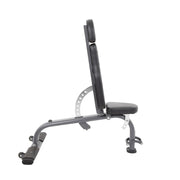 TKO's FID Bench, ideal for home, vertical markets, and commercial use, adjusts to accommodate your workout preferences and features a new easy handle design and rear transport wheels for easy mobility.