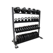 Customize the 4 tier rack to accommodate your needs. Options include a bumper plate storage, dumbbell shelf, kettlebell shelf or a med/wall ball rail. Shelves are lined with our unique styrene to protect product and keep the shelf looking new for years to come.