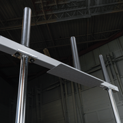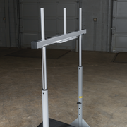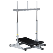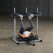 The Powerline Vertical Leg Press provides an impressive platform for obtaining huge muscle gains through isolated lower body workouts. The unique vertical design not only reinforces support for your back and hips, but also minimizes space used to perform the exercises. Extra-thick back pad and contoured head and neck pad lock you into the proper exercise position while providing comfort during your leg press or calf raise routines. Features include dual adjustable 1/2" steel locking pins, three different starting and stopping positions and a diamond plate steel press deck for no-slip control. Three 1" standard plate posts allow increased resistance for a progressive challenge every time you work out. The PVLP156X is crafted of durable alloy steel with an extremely tough powder coat finish. 400 lb. weight capacity. Olympic adapter sleeves are optional. Weight plate posts are 1" dia. Shown with optional Olympic Adapter Sleeves.